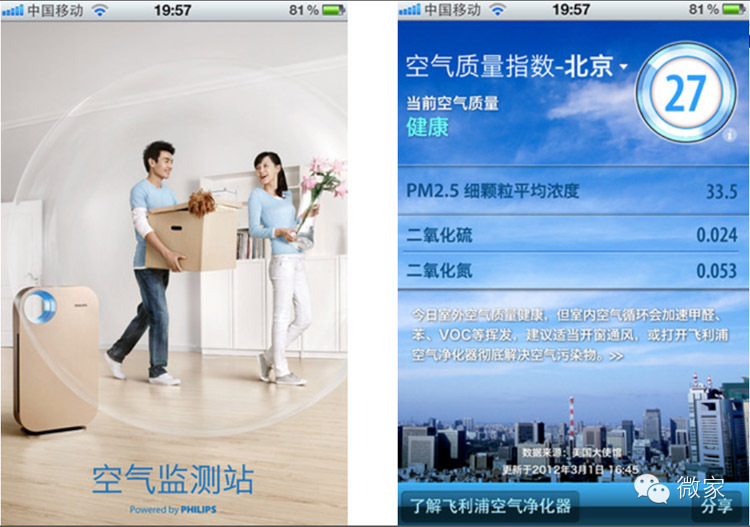 现在消费者都希望看到有创意,有内容的东西。调查发现,70%的消费者偏好通过一篇文章而不是广告来了解某公司。而内容营销的花费只相当于传统营销的62%。例如飞利浦做了个APP—“空气监测站”。能够测量室内的空气质量,人们根据空气质量,去了解他的空气净化器。他其实是把内容变成了一个营销方式。